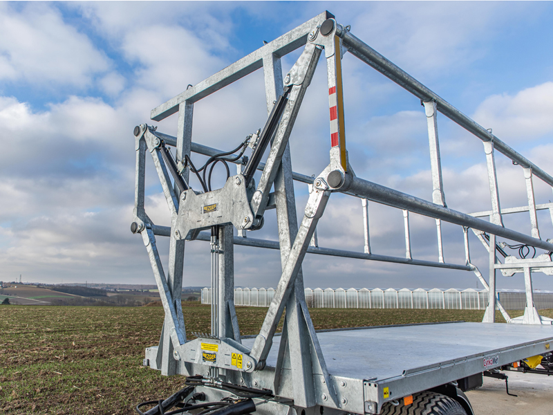 Mit einer Brückenlänge von ca. 8.200 mm innen bietet er Platz für 24 Rundballen mit einem Durchmesser von 1.360 mm oder 24 Quaderballen mit 2.500 mm Länge.