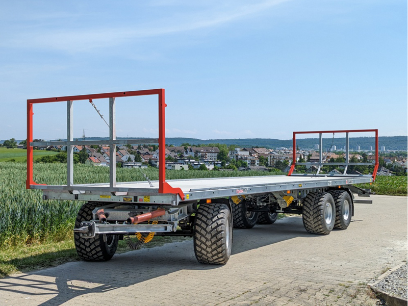 Seit Frühjahr 2021 ist der neue 3-Achs-Ballentransportwagen (Ballenwagen) mit 19 t Gesamtgewicht und 500er Bereifung auf dem Markt. Mit 1.190 mm Brückenhöhe können 4 Quaderballen mit 700 mm Höhe übereinander geladen werden. Der kompakte Achsabstand von 4.872 mm zwischen Vorderachse und der ersten Tandem-Achse macht den Plattformanhänger sehr wendig.